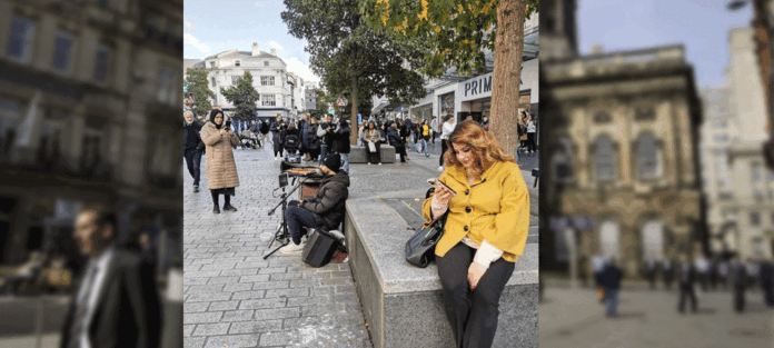 ලිවර්පූල් නගර මධ්යයේ දී ඊයේ මගේ ජංගම දුරකථනයෙන් ගන්නා ලද මෙම රූපය, නූතන නාගරික ජීවිතයේ සංකීර්ණත්වය මනාව ග්රහණය කර ගන්නා අතර, පුද්ගලයන් තමන්ගේම ලෝක තුළ රැඳී සිටින අතරතුර හවුල් පොදු අවකාශයන්හි සහජීවනයෙන් සිටින ආකාරය පිළිබඳ සියුම් අවබෝධයක් ලබා දෙන බව මට සිතේ. සමස්තයක් ලෙස දර්ශනය කාර්යබහුලයි, නමුත් එකිනෙකට වෙනස් අවස්ථා දෙකක් කේන්ද්රස්ථානයක් නිර්මාණය කරමින් නියැලීමේ සහ විසන්ධි කිරීමේ ප්රතිවිරෝධතා කෙරෙහි මගේ අවධානය යොමු කෙරුවේය.