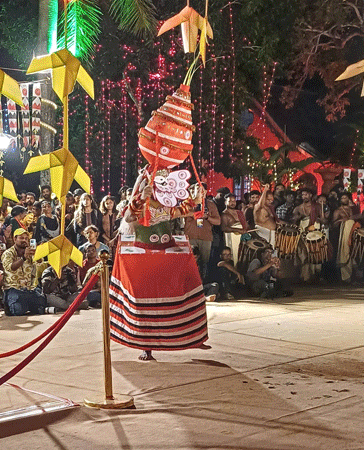 අභිලාෂ් හයයි තිහ වෙද්දී මා කැටුව එහි යයි. අදාල භූමිය සකසා ඇත්තේ කේරළ ව්යවස්ථාදායක සභාවේ කෞතුකාගාරය ඉදිරිපිට ය. එය කුඩා කෝවිලක අනුරුවක් සහ කොඩි ගසක් සහිත සතරැස් බිමකි. නර්තනයේ යෙදෙන්නන්ගේ පාද වල පහසුව තකා එහි කාපට් එකක් අතුරා තිබේ. අවට බිම විදුලි බුබුළ වලින් අලංකාරව සරසා ඇත.
