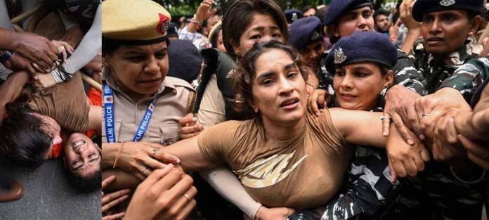 එවිට ඔලිම්පික් පදක්කම් දිනාගත් වින්ගේෂ් පොගාට් පවසා තිබුනේ ‘‘ඉන්දියා ගේට් එක රට වෙනුවෙන් දිවි පිදූ රණවිරුවන්ගේ ස්ථානයයි. අපි ඔවුන් තරම් ශුද්ධ නොවෙමු, නමුත් ජාත්යන්තර මට්ටමින් ක්රීඩා කරන විට අපගේ හැඟීම් එම සොල්දාදුවන්ට සමානයි” යනුවෙනි. අනතුරුව ඔවුහු නරේන්ද්ර මෝදි නව පාර්ලිමේන්තුව විවෘතකරනදා, මල්ලවපොර ක්රීඩකයින් සහ ඔවුන්ගේ ආධාරකරුවන් ‘මහාපංචායට්’ නැමැති නව පාර්ලිමේන්තු ගොඩනැගිල්ල දෙසට ගමන් කිරීමට පෙර ඉදිරි ආරක්ෂක වළල්ල බිඳ දැමූවෝය. එහෙත් ජන්තර් මන්තාර් හි විරෝධතා භූමියේ නාට්යමය දර්ශනය දිග හැරෙන විට, පසුගිය ඉරිදා දිල්ලි පොලිසිය, ලෝක ශූරතා ලෝකඩ ජයග්රාහක විනේෂ් ෆොගට් සහ තවත් ඔලිම්පික් පදක්කම්ලාභීනියන් වන බජ්රංග් පුනියා සමඟ ම අත්අඩංගුවට ගත් අතර පසුව නීතිය හා සාමය කඩ කිරීම සම්බන්ධයෙන් ඔවුන්ට එරෙහිව FIR ගොනු කළේය.