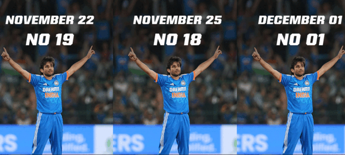 අයි.සී.සී ග්රේණිගත කිරීම් අනුව T20 පන්දු යවන්නන් අතර පෙරමුණෙහි පසුවන රවී බිශ්නෝයිගේ ශ්රේණිගත කිරීම් වෙනස් වූ අයුරු. 2023. 11. 22 – ඔහු ශ්රේණිගත කිරීම් වල 19 වන ස්ථානයේ පසුවිය.